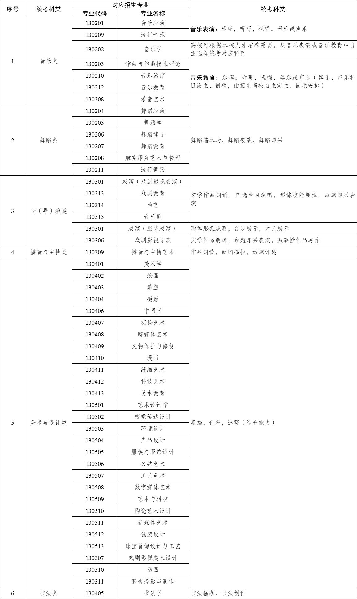 2.上述艺术类本科专业,依据教育部《普通高等学校本科专业目录(2020年版)》和《列入普通高等学校本科专业目录的新专业名单》中“艺术学”门类下设各专业进行编制,将根据教育部普通高等学校专业设置和调整情况进行更新。